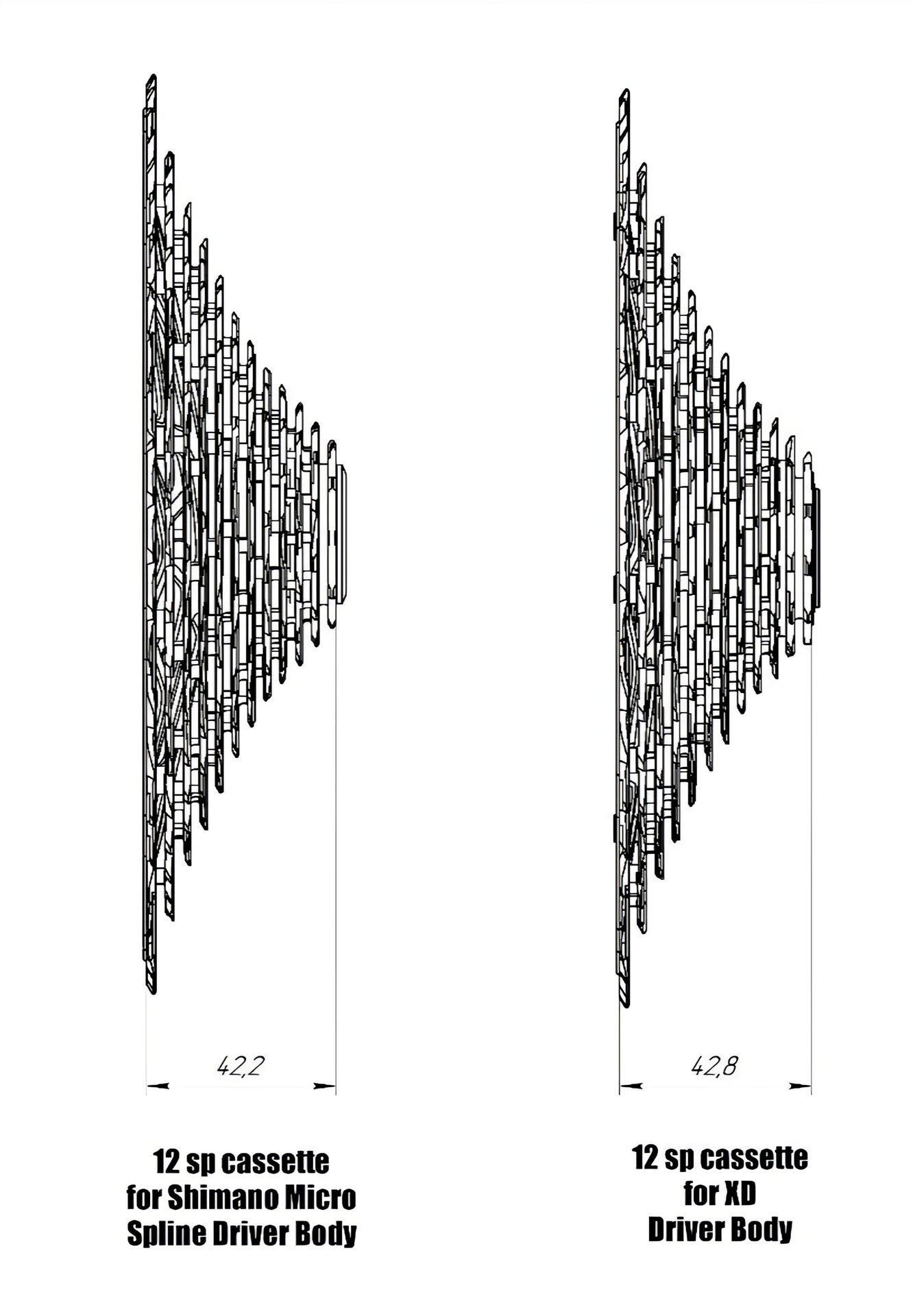 Various drivetrain components' manufacturers develop their groupsets in such a way to allow them to work perfectly within the same groupset, and it's great until you start mix-matching your drivetrain components. Due to differences in cassette widths, gaps between gears and corresponding shifter/rear derailleur indexing, setting up a perfectly operating drivetrain is a difficult one. Add more variables, such as straight/bent derailleur hanger, worn out shifter cable etc., and bicycle transmission setup may turn into a nightmare. Pictures below show differences in cassette widths depending on the group it's designed for. The difference in fractions of a millimeter is what can make your drivetrain unoperational, especially in 2019 when 11 and 12-speed groupsets exist with very narrow spacing between gears. That is, until you will match components, like cassettes, derailleur pulleys which correspond to the groupset you're using.